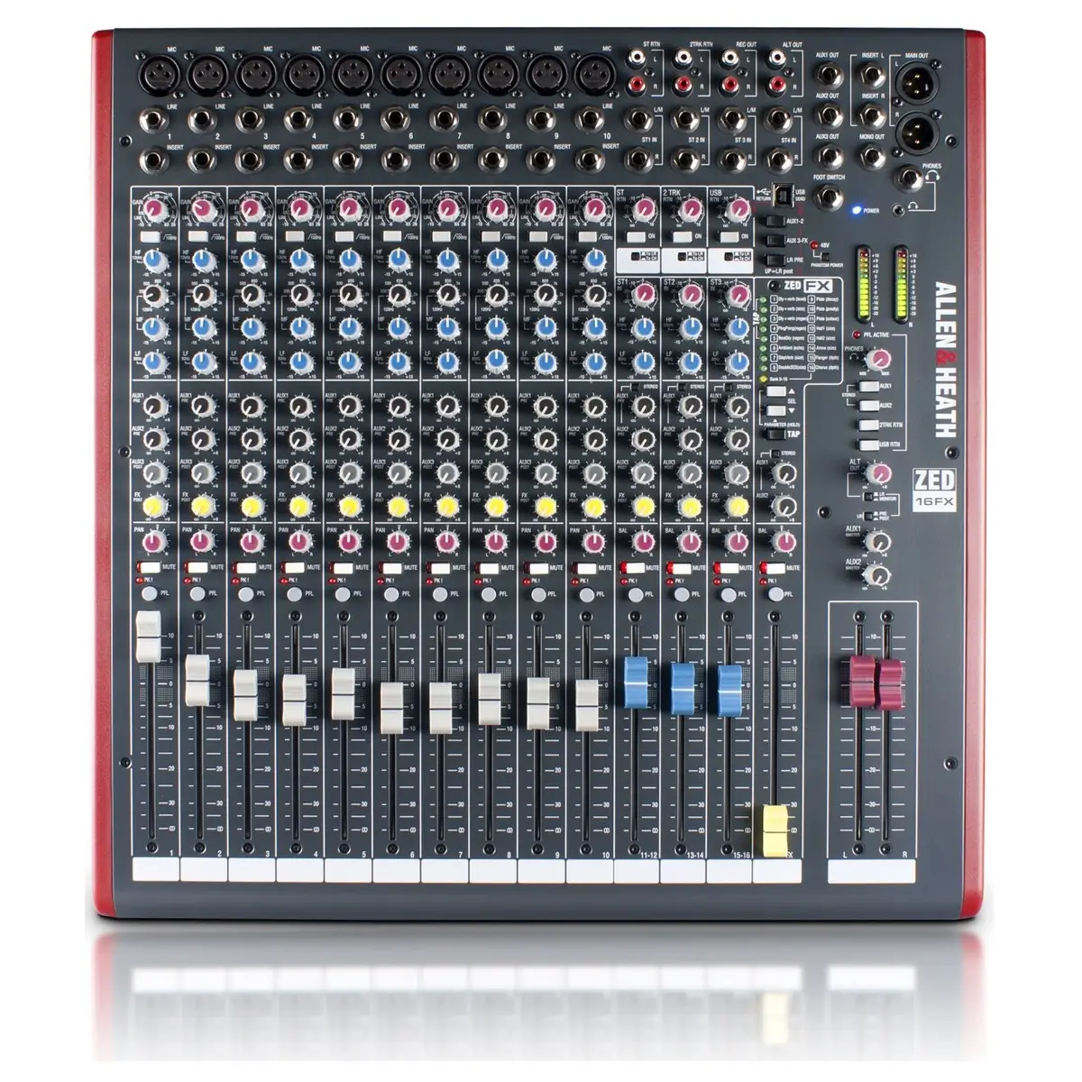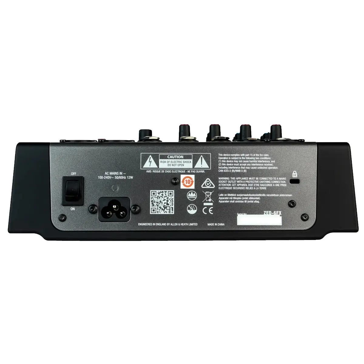 6-input console (2 Mic/Hi-Z/Line and 2 stereo) with 2-band EQ, FX volume and Pan on each channel, PFL headphone output and 48V Phantom Power. Features Multi Mode effects unit with Tap Tempo. With Low Cut Switches and LED display for master metering.