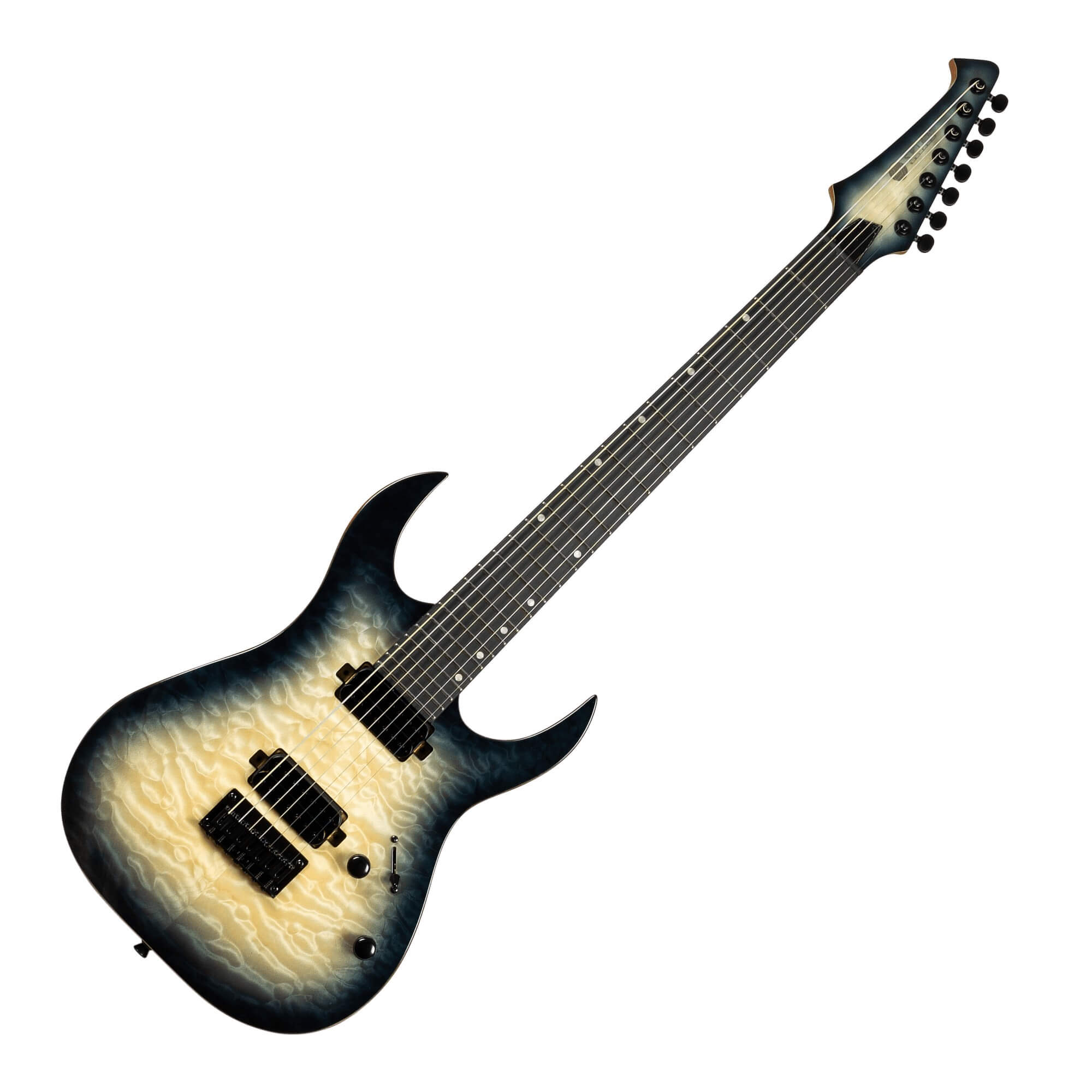 The S-507 is Spira’s flagship 7 string model, lovingly crafted for players who expect the highest level of performance and aesthetics. The S-507 features a luxurious mahogany body with a stunning quilted maple top, delivering both exceptional resonance and eye-catching beauty. The roasted maple neck and fretboard offer unmatched stability and a smooth, responsive playing experience, ideal for advanced techniques. Equipped with dual Villain seven string humbuckers, the S-507 provides powerful and articulate tones that excel in any genre, particularly rock and metal. The guitar boasts 24 jumbo frets, allowing for effortless playability and an expansive range. The premium components ensure superior tuning stability and precision, making the S-507 a reliable choice for both live performances and studio sessions. The S-507 combines top-tier craftsmanship with striking aesthetics combining to create the perfect blend of form and function, making it the ultimate choice for the most demanding seven string player.