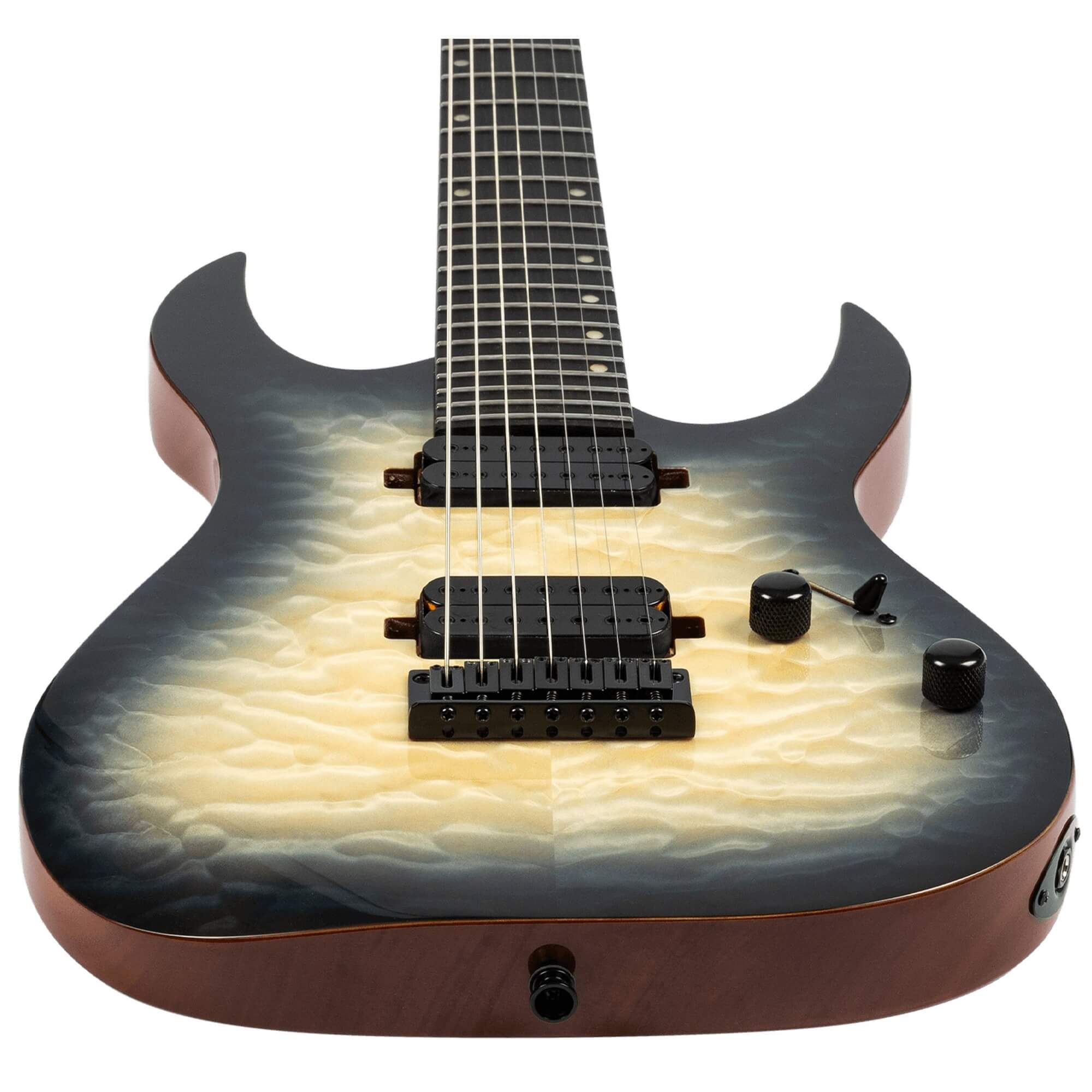 The S-507 is Spira’s flagship 7 string model, lovingly crafted for players who expect the highest level of performance and aesthetics. The S-507 features a luxurious mahogany body with a stunning quilted maple top, delivering both exceptional resonance and eye-catching beauty. The roasted maple neck and fretboard offer unmatched stability and a smooth, responsive playing experience, ideal for advanced techniques. Equipped with dual Villain seven string humbuckers, the S-507 provides powerful and articulate tones that excel in any genre, particularly rock and metal. The guitar boasts 24 jumbo frets, allowing for effortless playability and an expansive range. The premium components ensure superior tuning stability and precision, making the S-507 a reliable choice for both live performances and studio sessions. The S-507 combines top-tier craftsmanship with striking aesthetics combining to create the perfect blend of form and function, making it the ultimate choice for the most demanding seven string player.