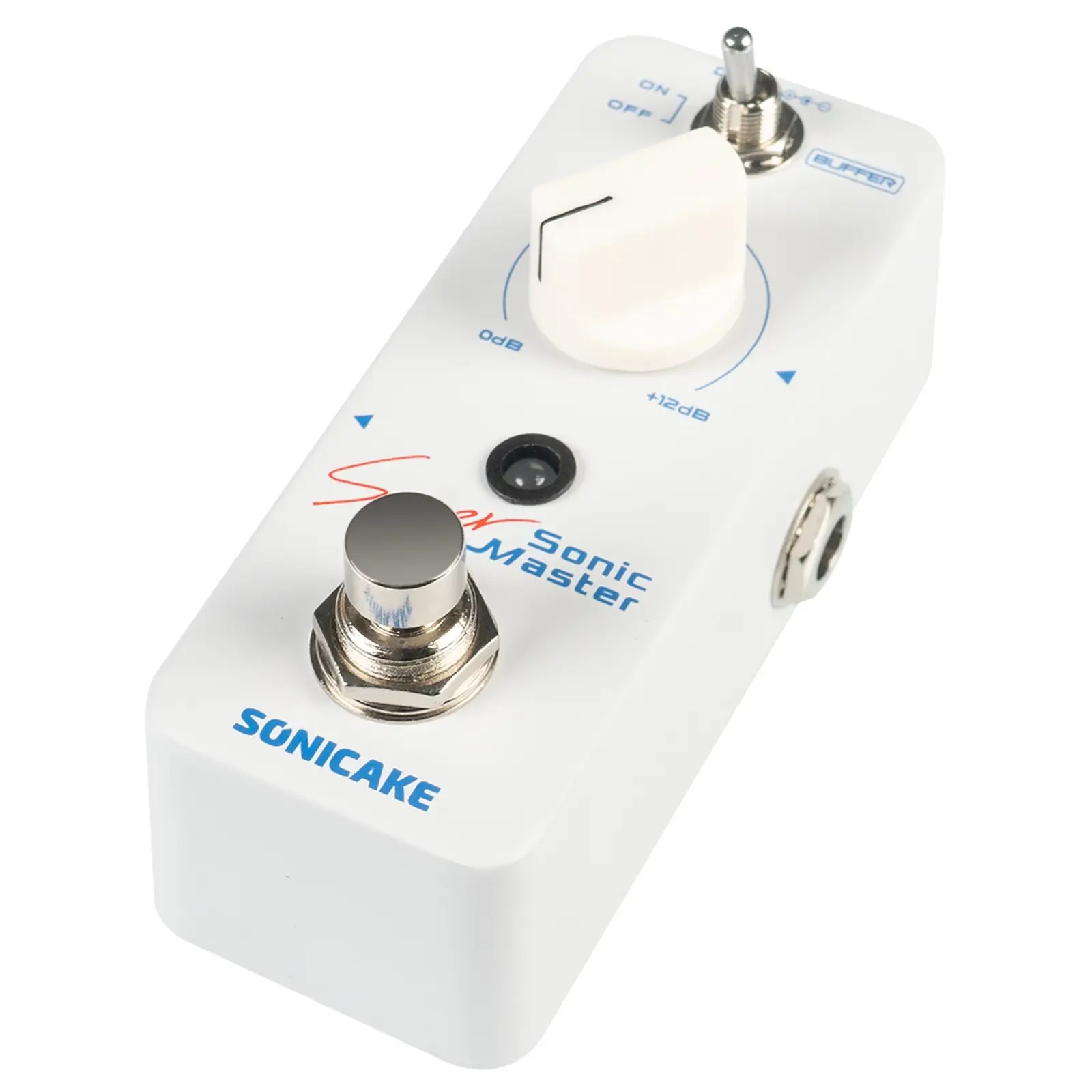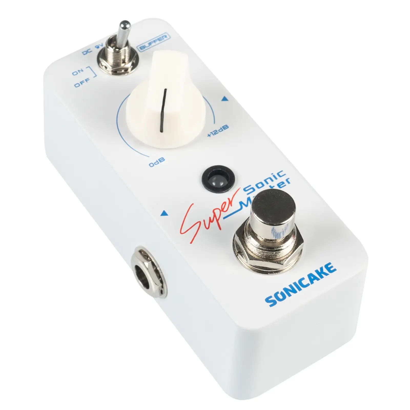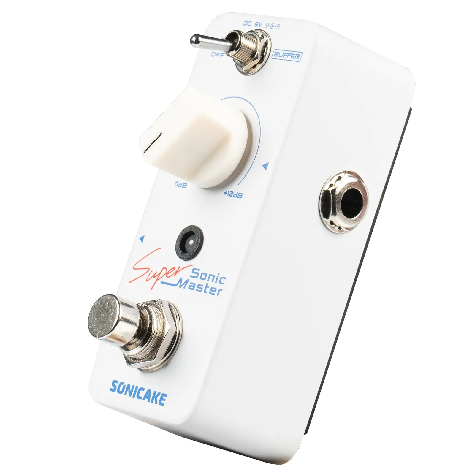 Sonic Super Master is a Mini Clean Boost Pedal with a Buffer and +12dB gain. It can be controlled to turn the Buffer function on/off through the "Buffer" toggle switch, and the gain effect of 0-12dB can be controlled through a knob.