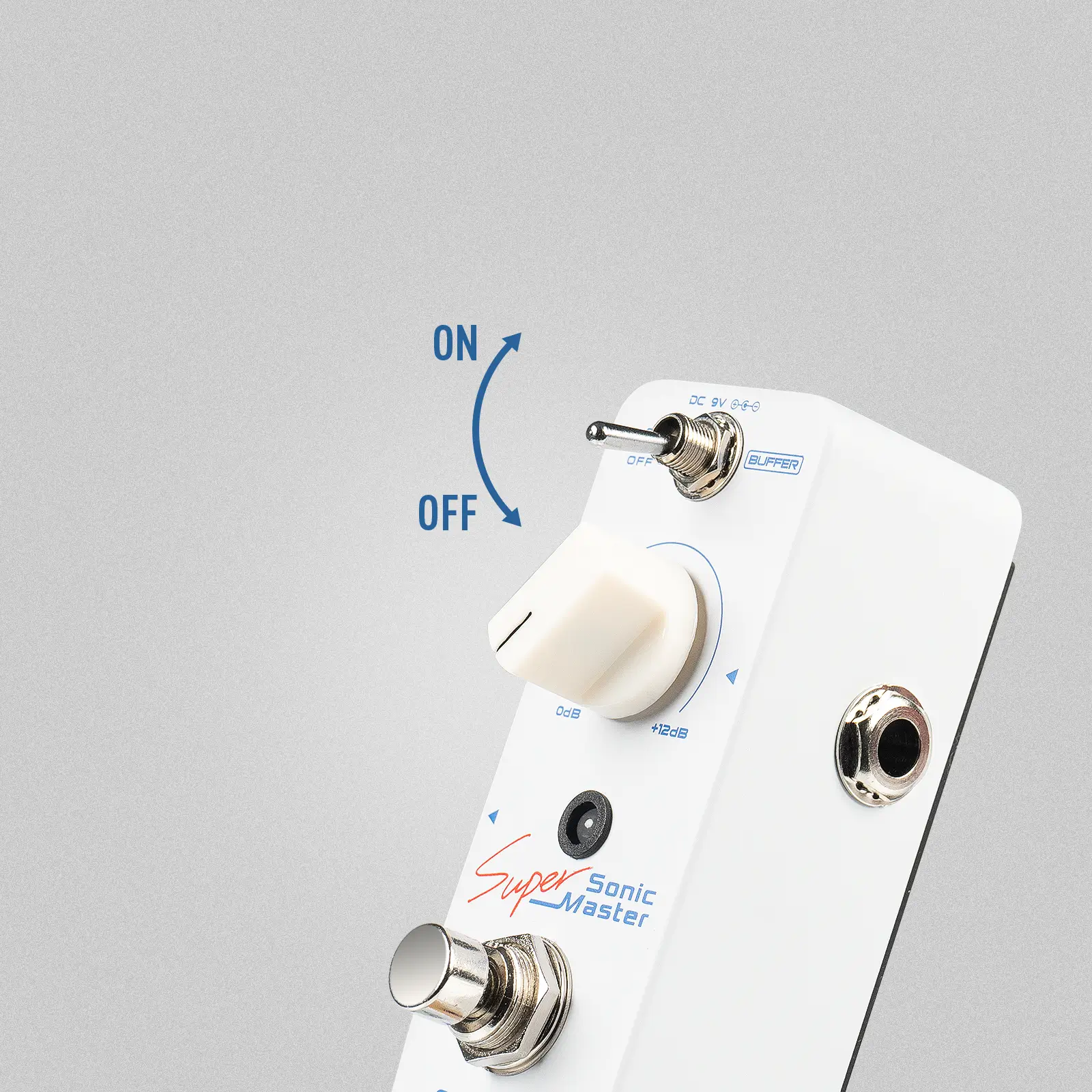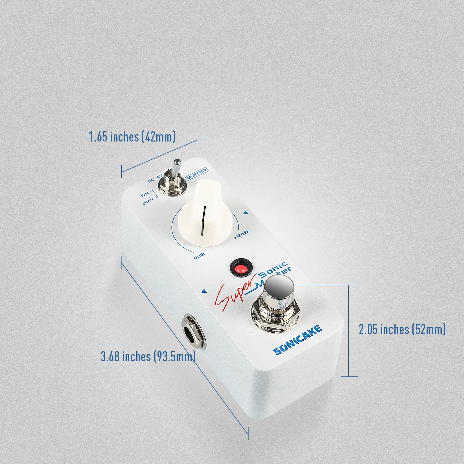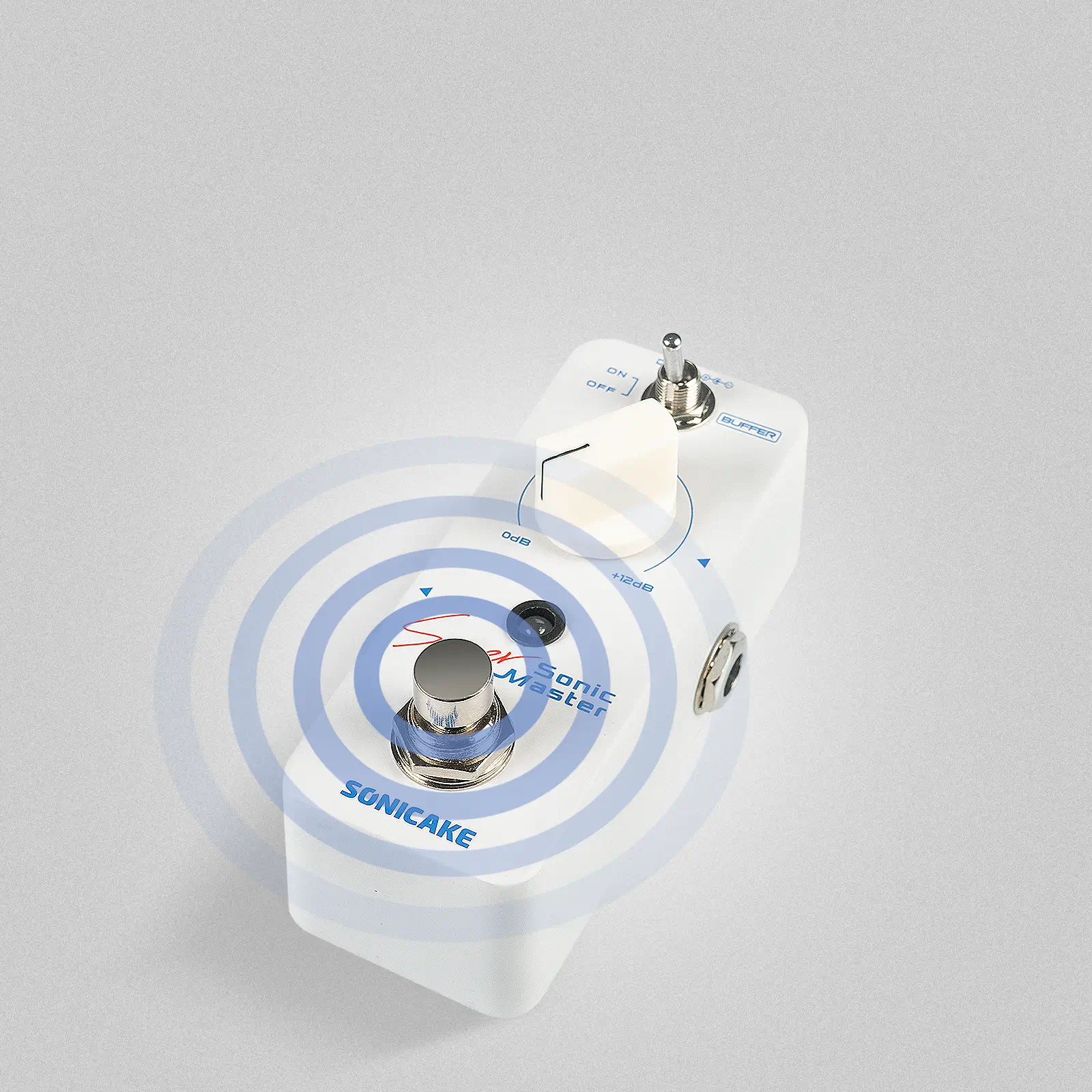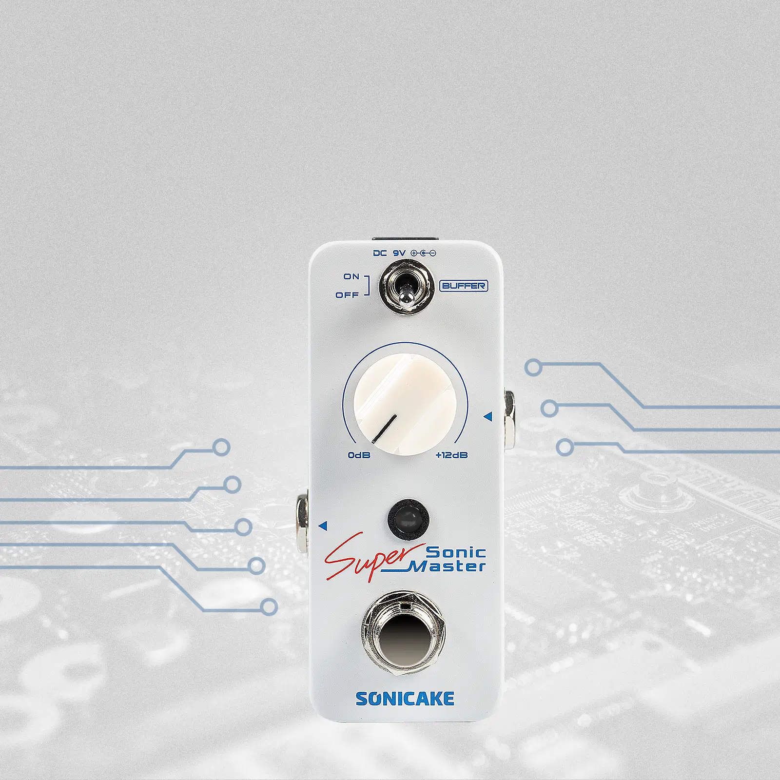 Sonic Super Master is a Mini Clean Boost Pedal with a Buffer and +12dB gain. It can be controlled to turn the Buffer function on/off through the "Buffer" toggle switch, and the gain effect of 0-12dB can be controlled through a knob.