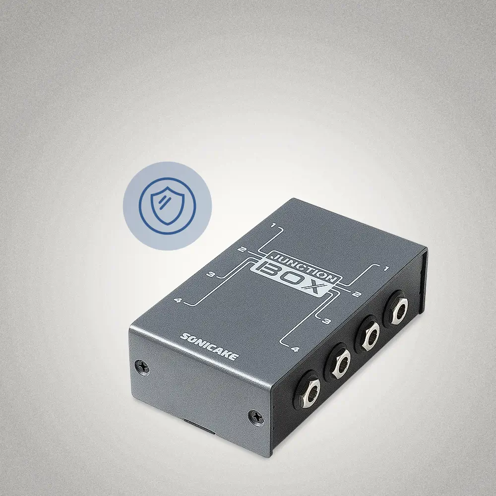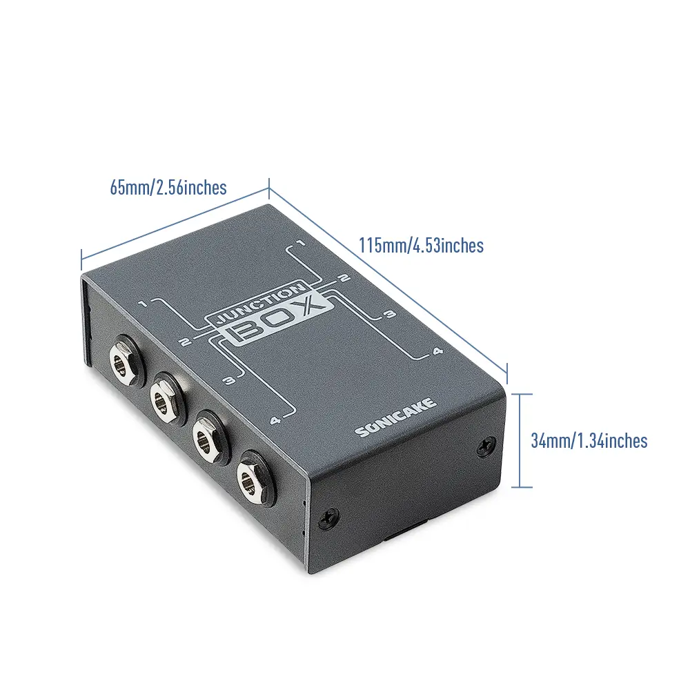 Junction Box has 4 pairs of stereo inputs and outputs, compatible with mono signals. Each channel is a true bypass design, so you don't have to worry about extra sound coloration. The Junction Box is a completely passive design and requires no batteries or power supplies. The full metal shell design is sturdy and durable, and an insulating plastic sleeve is used at the plug interface to effectively avoid ground signal interference. You can add it to your pedalboard to effectively use the space to organize your effects circuits and easily adjust different signal links. Get connected with amps, pedals, instruments - You decide!