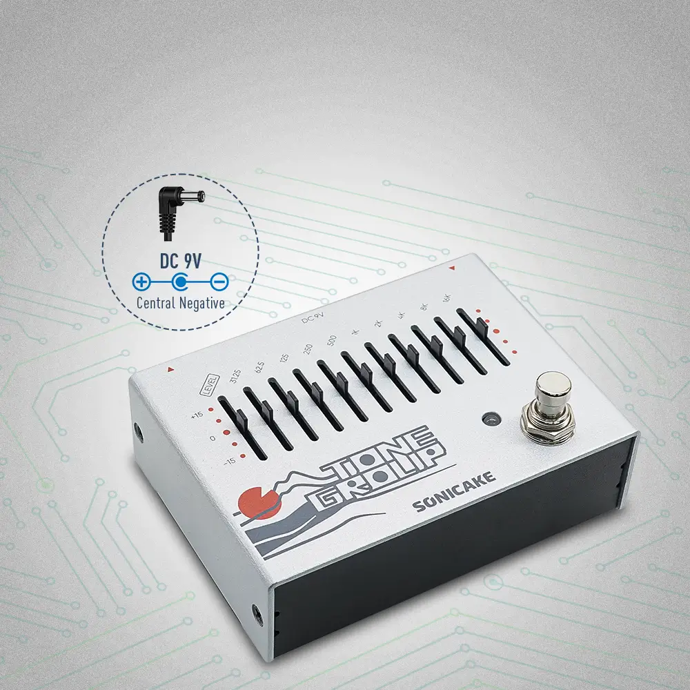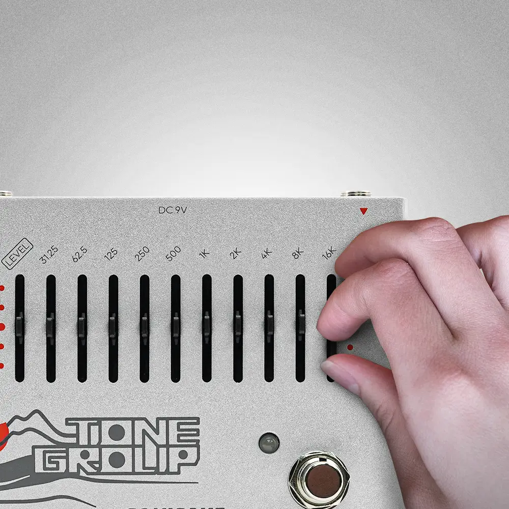 Tone Group is a professional true bypass 10-band graphic equalizer with analog circuit design. It features ten selected frequency bands based on classic EQ effect pedal for a variety of instruments, allowing you to precisely and quickly shape your tone with sliders.