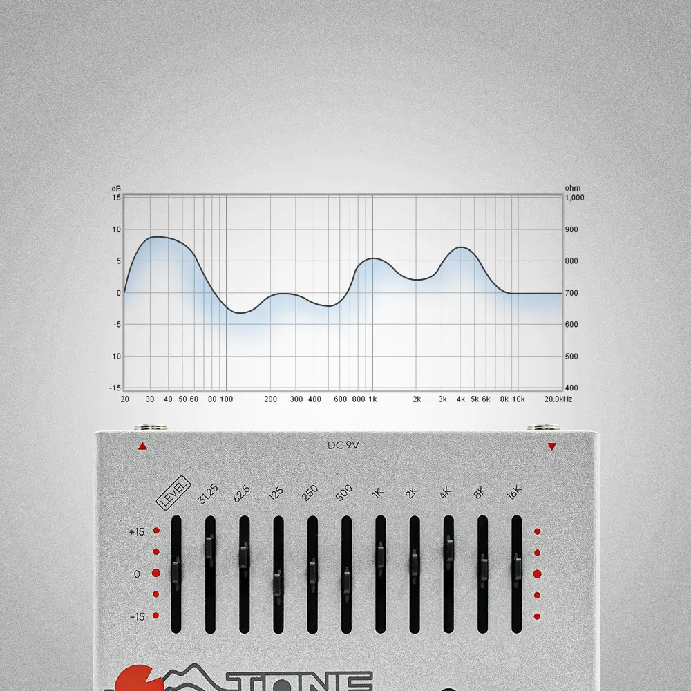 - 100% Analog 10-Band Equalizer based on Classic EQ Effect Pedal's Frequency Band