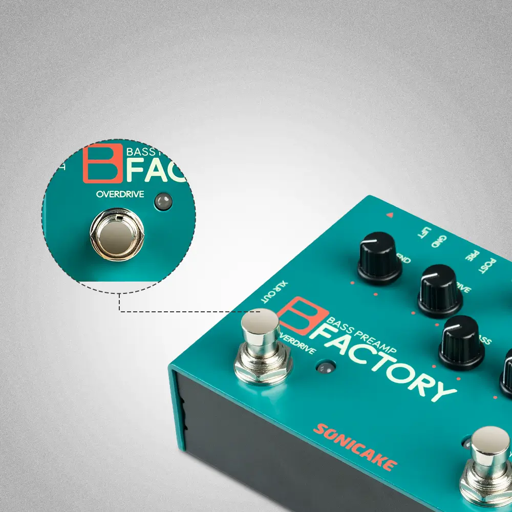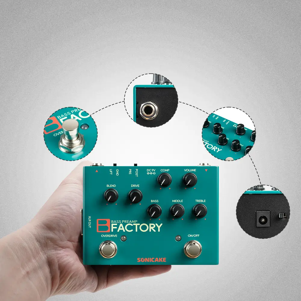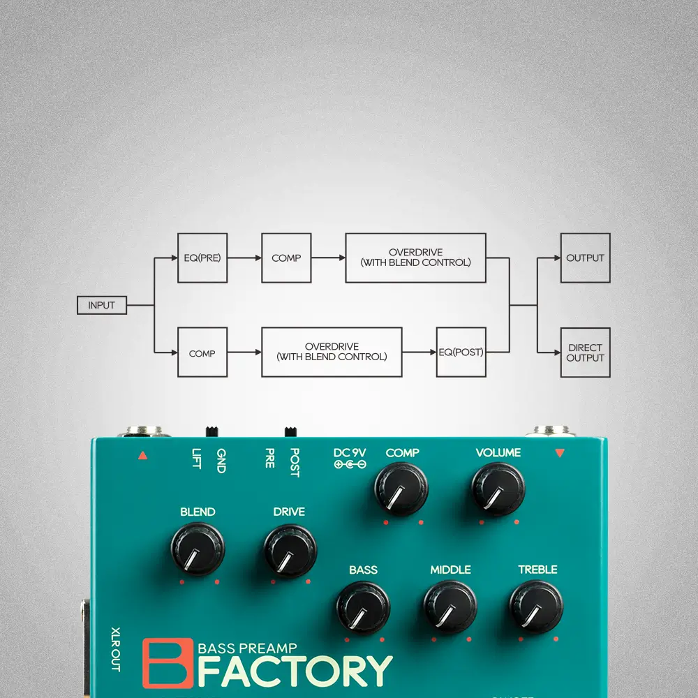 B Factory pedal is a Bass preamp with high impedance INPUT and XLR balanced output. Classic optical compressing sound, it preserves the original signal transients perfectly. Powerful 3-band EQ with PRE/POST selection for enhancing and shaping your bass tone, OVERDRIVE channel with a wide tonal range from overdrive to distortion. It would be a perfect solution for bassist.