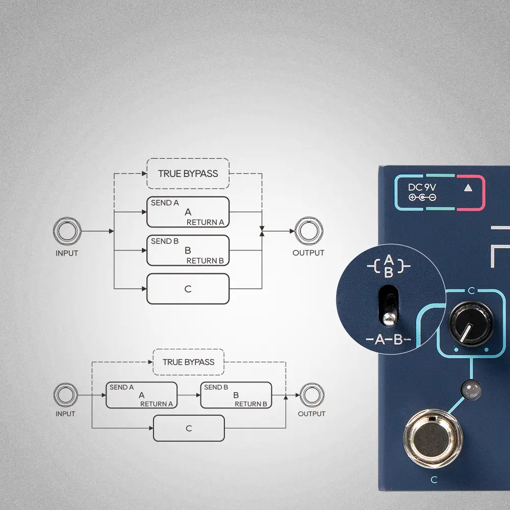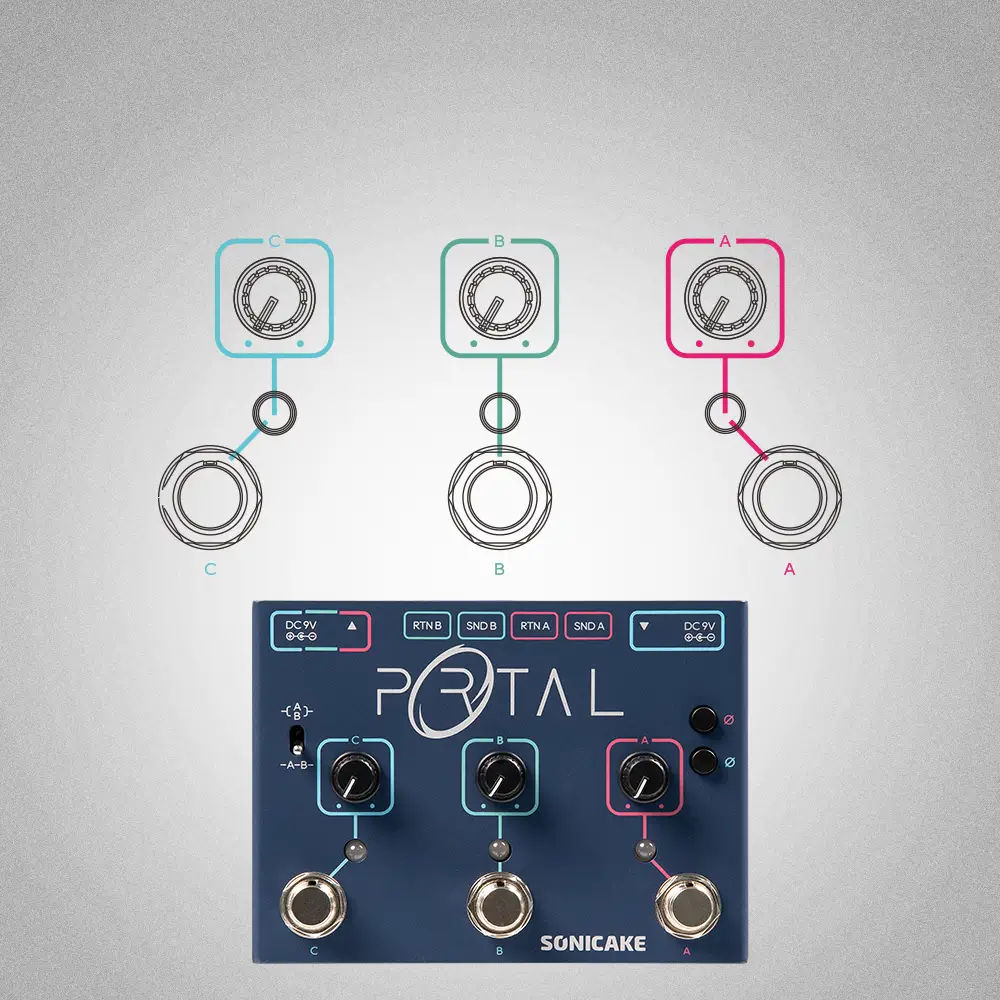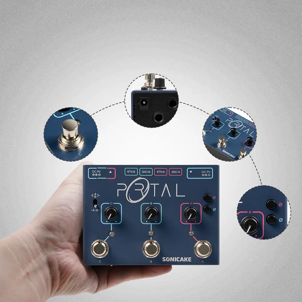 Portal is an active signal mixer with two working modes: parallel and series. In parallel mode, the signal mixer has two send/return loops and one main output, which can combine three independent inputs into one, or can be used as an active ABY as needed. In series mode, A and B are series channels. When the A/B switch is closed, channel A or B is bypassed. When all three switches are closed, it is true bypass.
