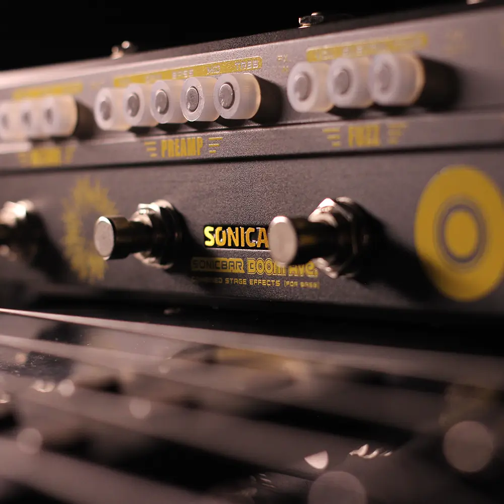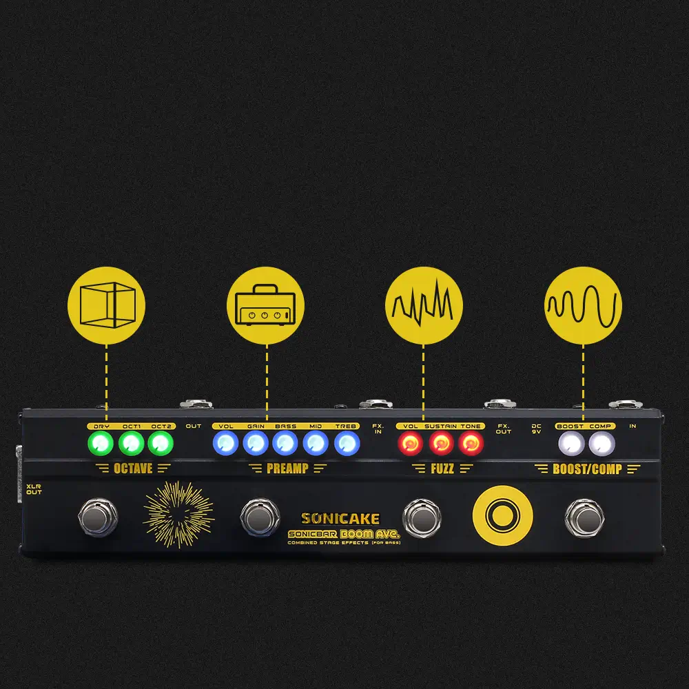 BOOM Ave. is a multi-effects bass pedal. Yeah, for BASS! All about that bass! We know sometimes you would feel ignored by the other band members. But hey, at Sonicake, they always believed that bassists are way more crucial than other memebers. True story! BOOM Ave. gives you 4 essentials for bass playing: a BOOST/COMP, a FUZZ, a PREAMP, and an OCTAVE. BOOST/COMP is as straightforward as it is. It comes with a volume boost and a compressor. FUZZ is pretty standard. Think about Russian Muff with some additional EQ twist. PREAMP is a classic. They try to pay their tribute to the legendary Ampeg style tone. OCTAVE is dual sub octave. But you can blend the ratio of the original dry signal and the octaves. It has an FX LOOP after preamp section. You can add whatever you wanna add in that loop. It also has an XLR OUT for you to send the balanced signal to your sound card or PA mixer.