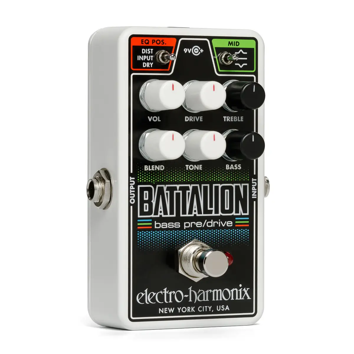 The all-analog circuitry of the EHX Nano Battalion provides an amazing array of bass tones in a sturdy, compact package. A versatile MOSFET drive circuit that can deliver everything from subtle, light overdrive to fully saturated distortion forms the pedal’s core. The Nano Battalion features a three-band EQ with three EQ position modes for maximum flexibility and sound shaping control. The three-band EQ includes Treble (boost/cut above 1kHz) and Bass (boost/cut below 200Hz) controls, plus a Mid switch which provides a 9dB boost or cut at 500Hz. Three signal path options determine where the EQ is applied. In Distortion Mode the EQ comes after the distorted signal and has a powerful effect on its timbre while the clean signal is not affected. In Input Mode the EQ comes first in the signal path affecting both the clean and distorted signals. Boosting frequencies in this mode can drive the distortion to a more saturated state. In Dry Mode the EQ affects the clean signal, but not the distorted signal. The Nano Battalion includes a ¼” input jack and ¼” output jack. When a normal TS cable is connected to the output jack it delivers an unbalanced signal. When a TRS cable is plugged into this jack, it outputs a balanced signal that can go directly into a mixing console or recording interface.