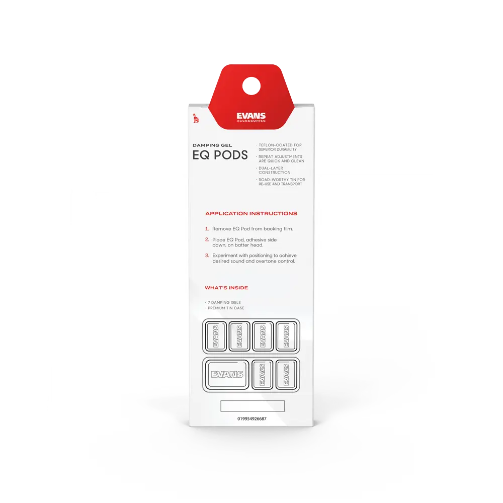 Sculpt your sound with EVANS EQ Pods, the ultimate solution to overtone, tuning, and resonance control. These polymer gels feature a Teflon-coated top side, helping them to remain stain-free and hold their shape. Designed for experimentation, you can apply and remove without surrendering grip, shape, or effectiveness.