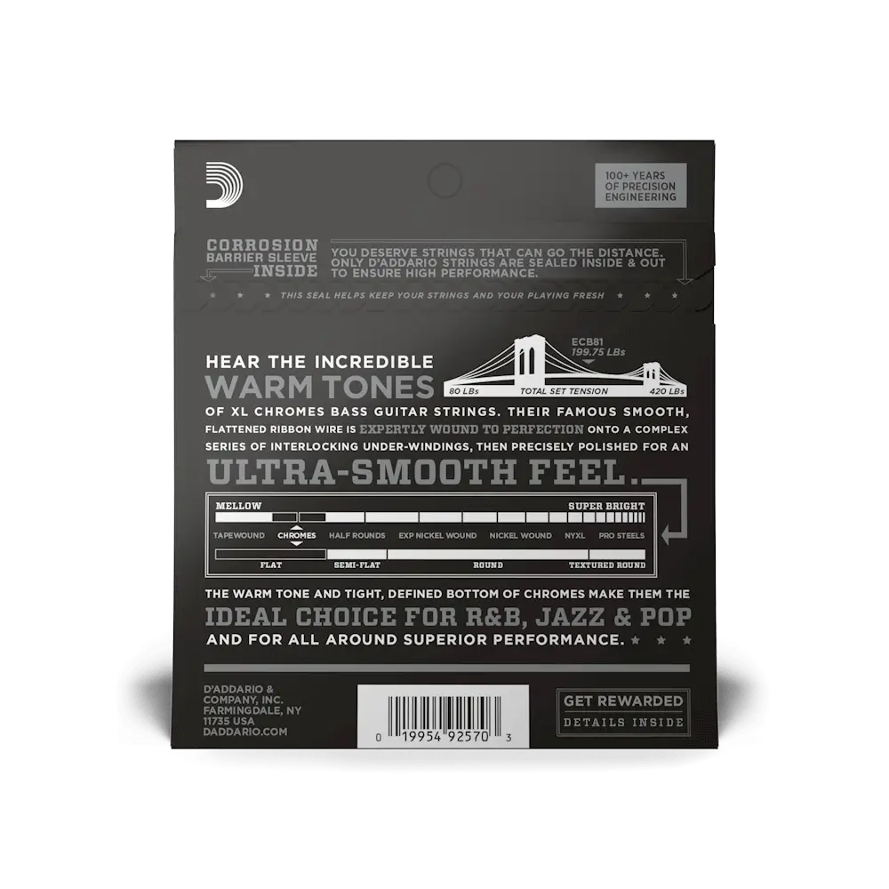 Οι χορδές XL Chromes είναι από τις πιο ζεστές και απαλές χορδές μπάσου που προσφέρουμε. Αυτές οι χορδές με επίπεδη περιτύλιξη προσφέρουν εξαιρετικά απαλή αίσθηση και σκούρο, αλλά ζεστό ήχο, ενώ επιτρέπουν την κίνηση στο ταστιέρα χωρίς θόρυβο από τα δάχτυλα. Κατασκευασμένες με πυρήνα από χάλυβα υψηλής περιεκτικότητας σε άνθρακα, οι χορδές Chromes από ανοξείδωτο χάλυβα με επίπεδη επένδυση τυλίγονται με εξειδίκευση σε μια σειρά αλληλοσυνδεόμενων υποτυλίξεων και στη συνέχεια γυαλίζονται με ακρίβεια για απαράμιλλη απαλότητα και ηχητική παρουσία που συνδυάζεται υπέροχα στη μίξη. Αυτό το σετ με κανονικό πάχος 45-100 έχει ωραία ομοιόμορφη ένταση, φωτεινό τόνο και σφιχτά χαμηλά.